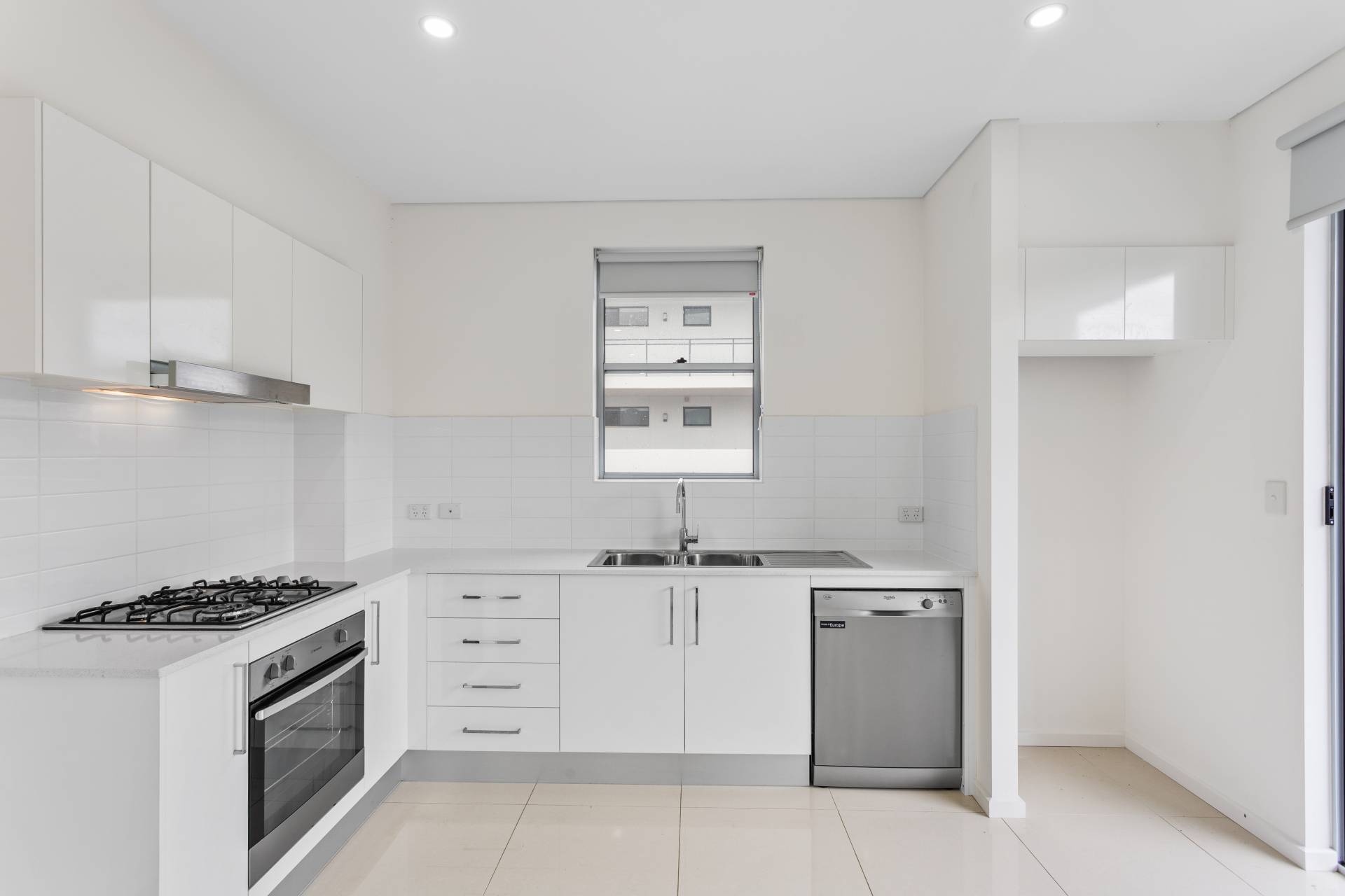 Spacious living area with a covered entertainer’s balcony, tiles throughout and a sleek stainless-steel kitchen.
