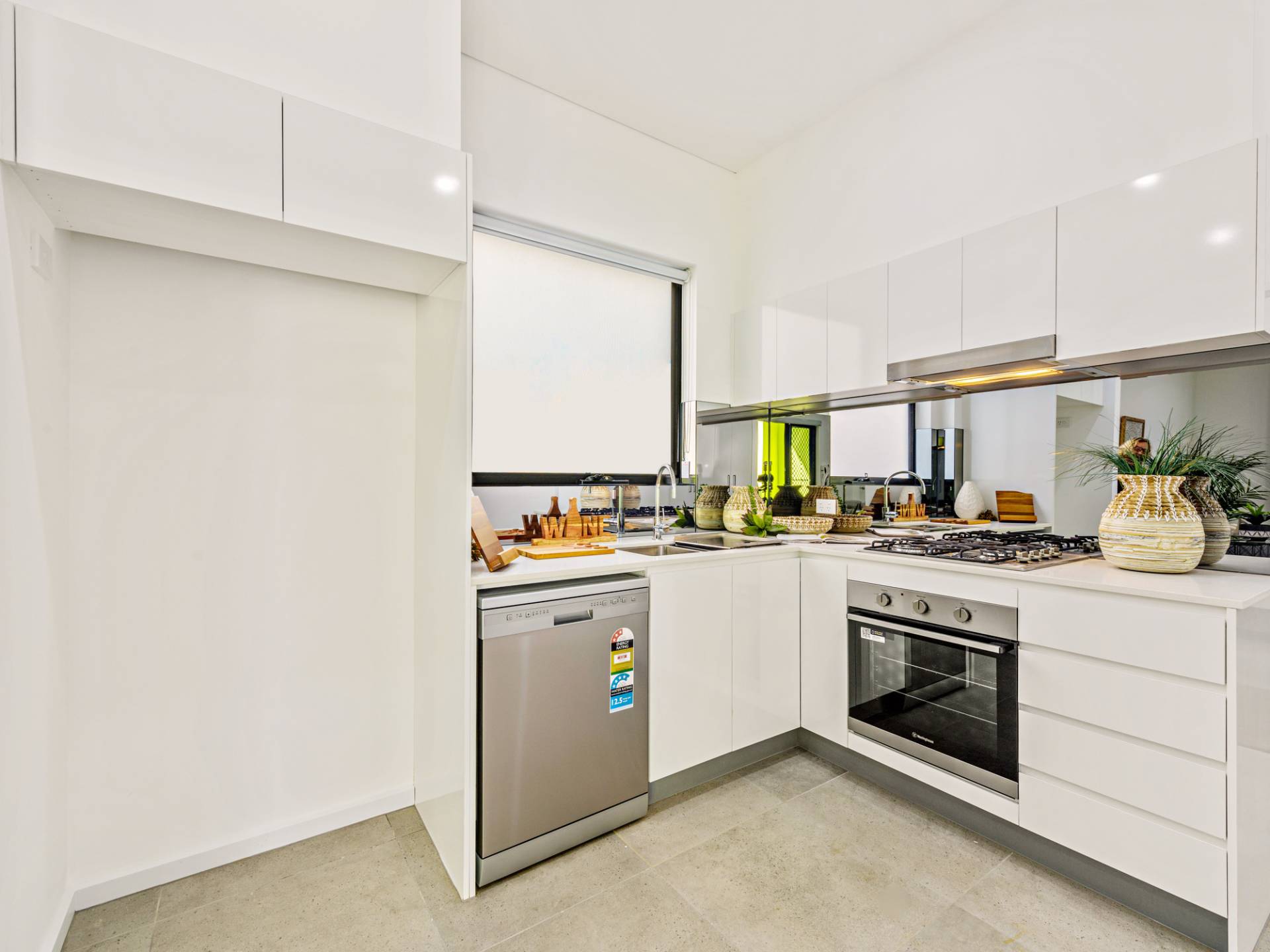 Spacious living area with a covered entertainer’s balcony, tiles and carpet throughout with a sleek stainless-steel kitchen.